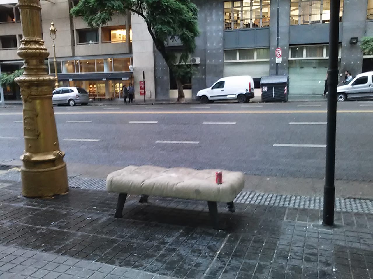 Un banco en la vereda y una lata de gaseosa apoyada encima. La escena, registrada en Diagonal Sur a pocos metros de la avenida Belgrano, podría repetirse sin dificultad en muchos otros rincones de la Ciudad. Se trata de una imagen cotidiana, que ya no llama la atención de quienes pasan por allí. Con el correr de los años, este tipo de situaciones se volvió habitual, casi parte del paisaje. Sin embargo, si uno retrocede un par de décadas, la presencia de estos bancos no era algo común ni esperable.
