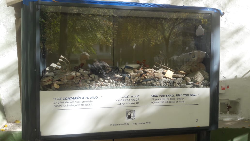 Me ubico en la esquina de Arroyo y Suipacha. Sobre la izquierda está la parroquia y colegio Madre Admirable. Tiene una placa colocada en 2021, recordando los 100 años de su creación. También hay otra placa en homenaje a Juan Carlos Brumana -quien era vicario de dicha parroquia-,y a todas las víctimas del atentado del 17 de marzo de 1992. Sobre la derecha se encuentra la plaza Embajada de Israel, precisamente, en la esquina donde estaba el edificio destruido por el accionar terrorista, trágico suceso del cual se cumplieron recientemente 30 años. En la superficie de la plaza se encuentran varios carteles a modo de homenaje y una vitrina que contiene restos de la explosión.